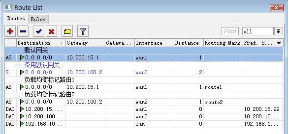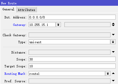 配置完标记路由后,我们进入ip route配置路由,首先设置负载均衡的标记路由,首先设置第一条线路的路由标记,设置routing-mark=route1: