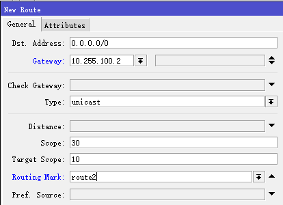 设置第二条线路的路由标记,设置routing-mark=route2:
