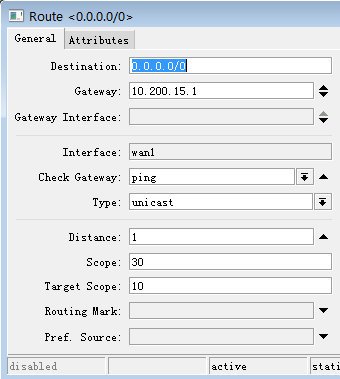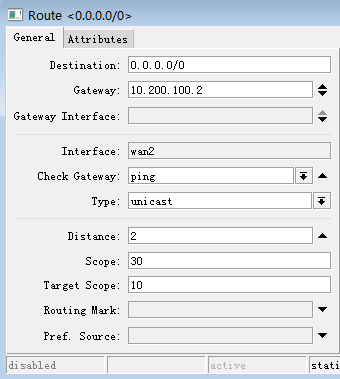 distance设置为1,并设置check-gateway=ping,通过ping监测网关状态,注意默认路由是RouterOS路由器自身的出口路由,之前配置的routing-mark是对路由器下用户的策略,和RouterOS路由器没有关系: