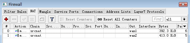 最后配置nat转换规则,进入ip firewall nat中配置action=masquerade,分别对2条线路做伪装: