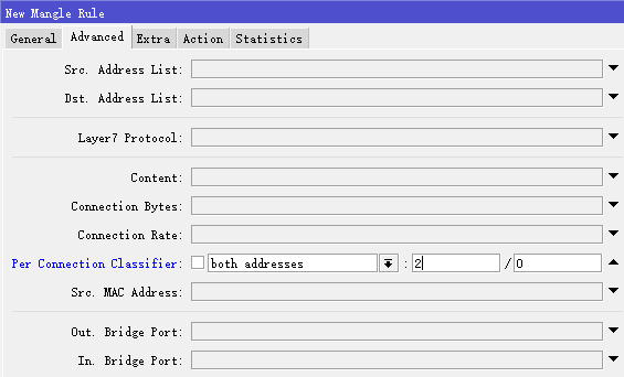然后进入advanced菜单下,可以看到per-connection-classifier分类器,选择both-addresses,设置参数为2/0(both-addresses,代表取目标IP和源IP地址的哈希值,2/0意思是,2代表两条线路,那么引入一个除法算式“哈希值/2”余数为0的标记一条线路,余数为1标记第二条),线路数增加就改变除数值,依次类推:
