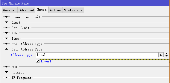 接着,进入extra菜单下,选择dst-address-type=!local,即排除目标是本地地址: