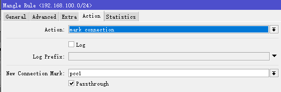 src-address=192.168.100.0/24 new-connection-mark=pcc1 passthrough=yes \