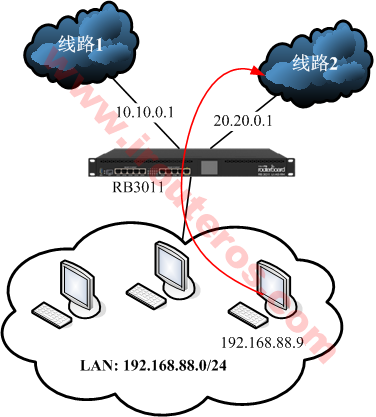 根据上图的一个双线网络结构,配置主机192.168.88.9走线路2,其余主机走线路1