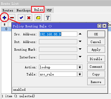 进入ip route rule,新建一个规则,并设置src-address=192.168.88.9,table=src_rule