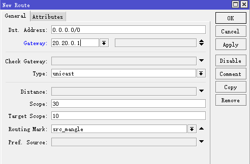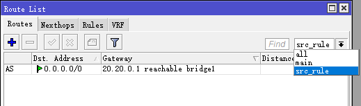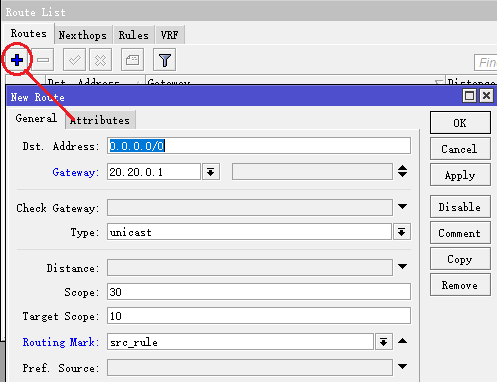 进入ip route,添加规则,选择routing-mark=src_rule,即src_rule表的网关20.20.0.1