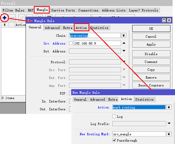 接下来看看mangle标记的方法,进入ip firewall mangle标记源地址192.168.88.9的策略,选择链表prerouting