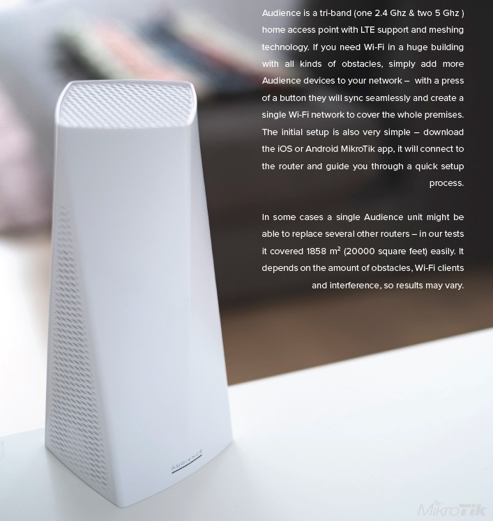 MikroTik今年推出了一款非常个性的家庭WiFi设备--Audience,提供高速、可靠、易于管理(还是要有基础的人操作比较好),能覆盖每个房间和每个角落,特别是大户型家庭,这次Audienc的外观设计更加时尚优雅,因此一看就是针对高端家庭市场推出的产品。