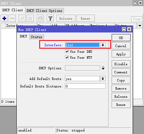配置完成后,进入ip->DHCP-client创建DHCP客户端,选择上use peer dns和add defaulte route=yes,操作如下: