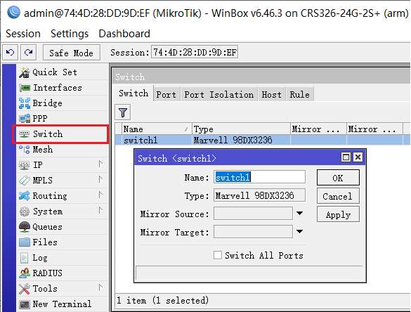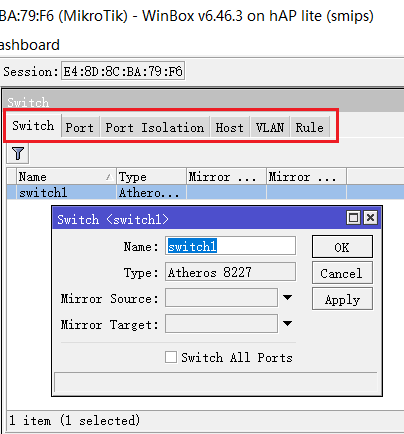 但是我们看到switch菜单和RB设备的有所不同,这里看看hAP lite的switch菜单