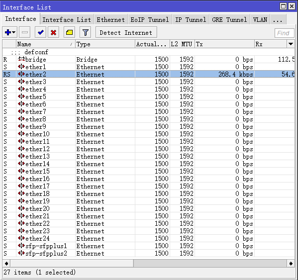 进入后,CRS326-24G-2S+默认已经写入了交换配置,26个接口做成一个bridge