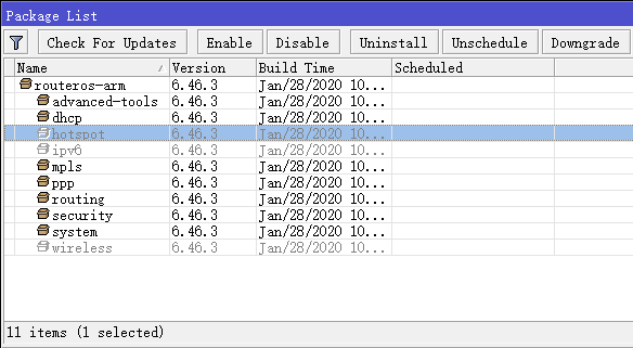 关于RouterOS的功能是由多个功能包组成,进入system-package菜单,可以看到对应的功能
