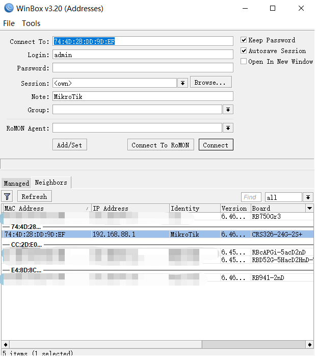 CRS326-24G-2S+使用的是双系统RouterOS和SWOS,但默认启动是RouterOS,通电启动后,和电脑连接网线,RouterOS系统可以通过winbox管理软件,使用mac地址登录到CRS326,无需用串口线连接配置